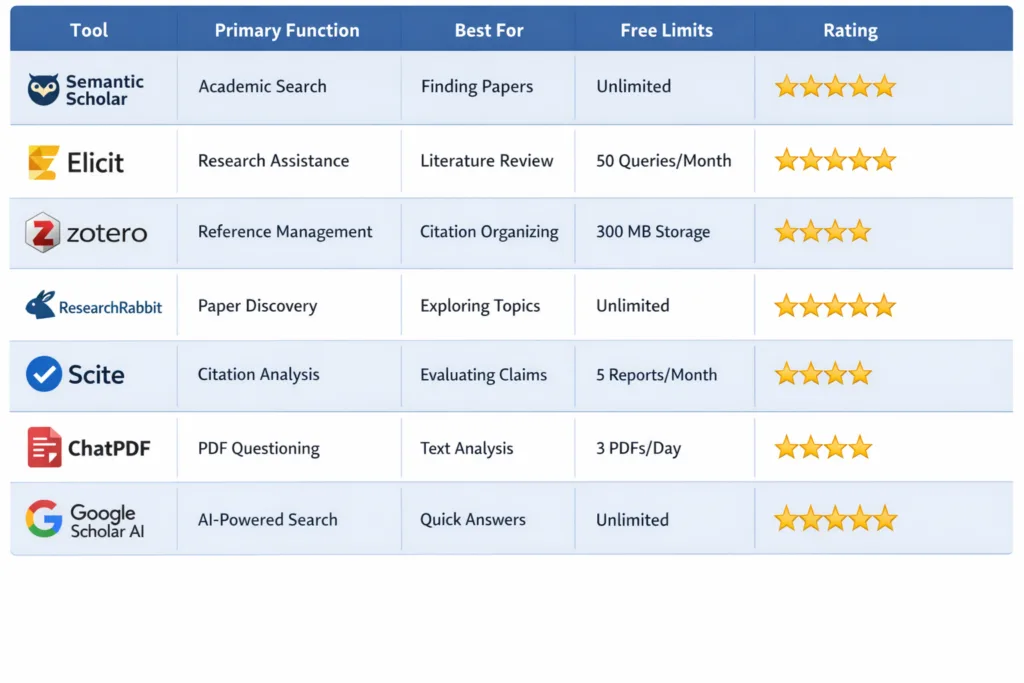 This comprehensive comparison highlights the best free AI tools for academic research available today. Each tool addresses specific research needs while maintaining completely free access tiers suitable for students and independent researchers. We’ve ranked these based on usability, feature depth, and real-world academic impact.